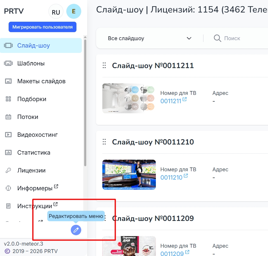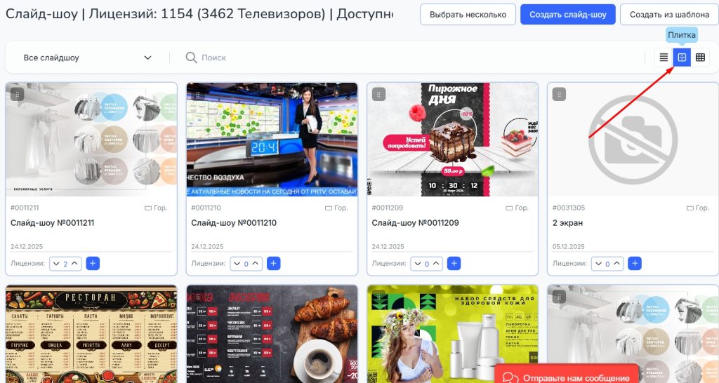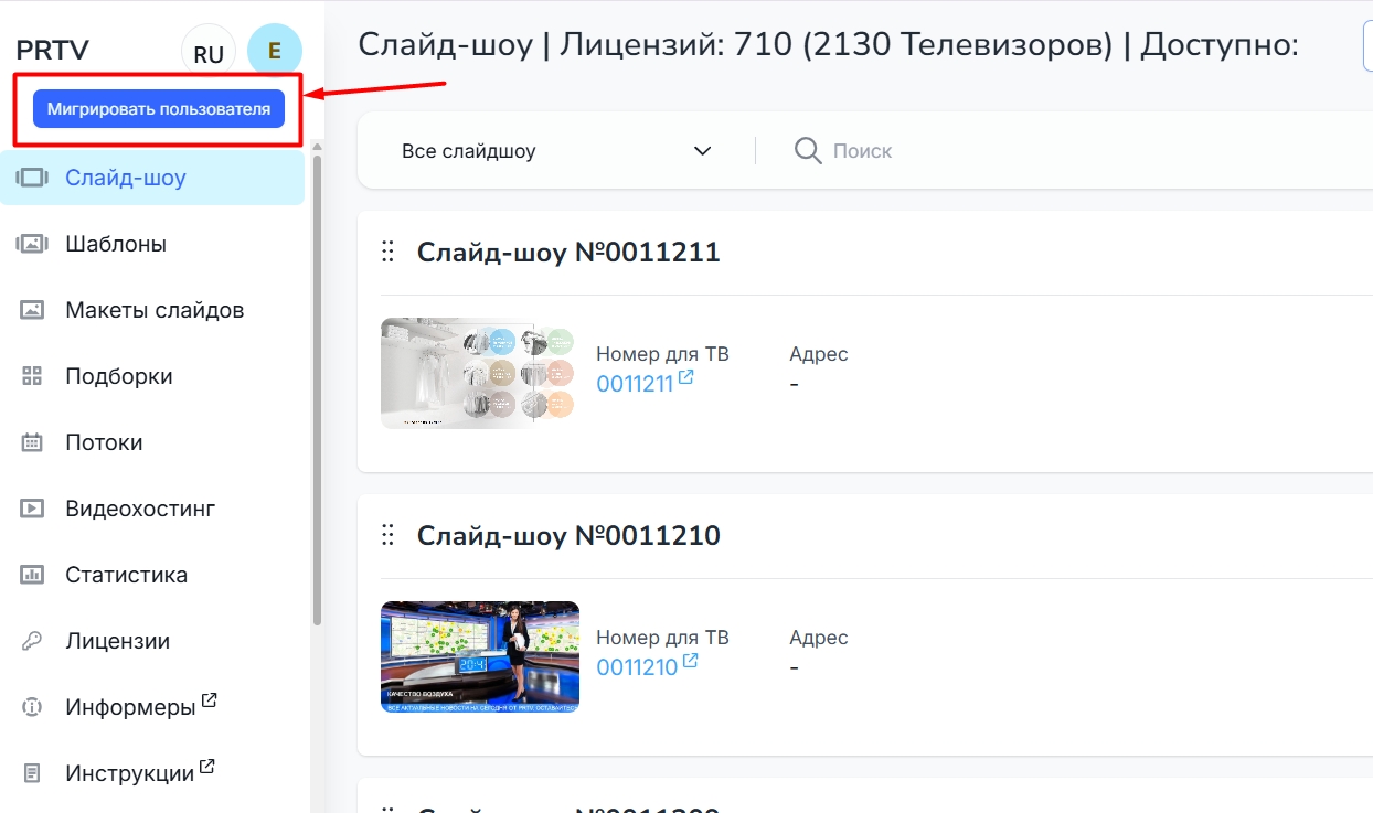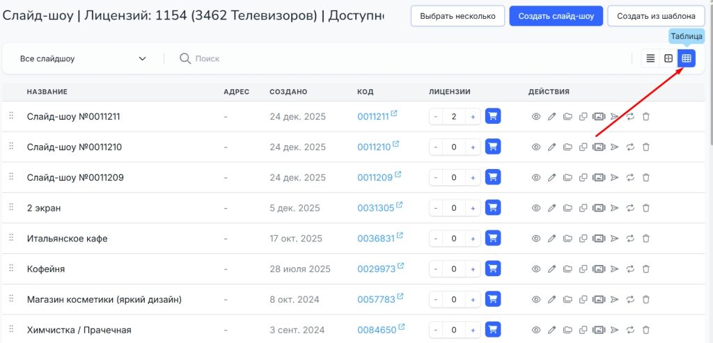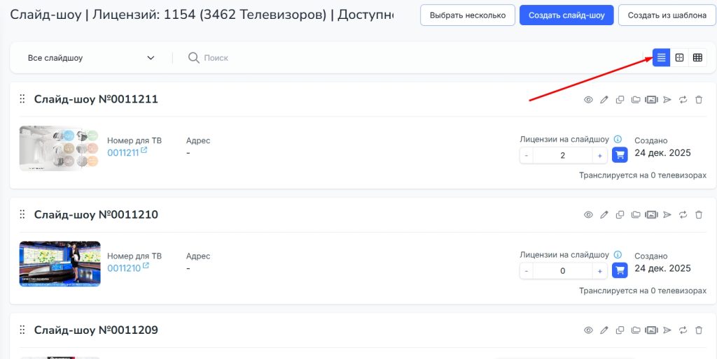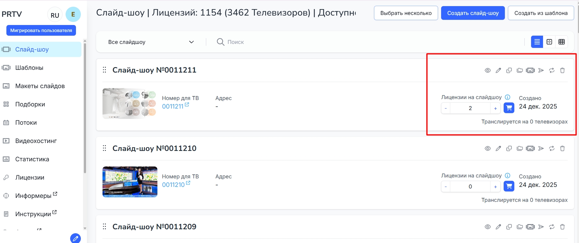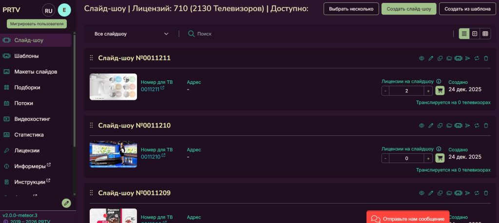 Обратите внимание, в новой версии PRTV стало доступно больше информации о ваших слайд-шоу. Указано количество телевизоров, на которых происходит трансляция, дата создания, функция быстрого включения/выключения любого слайд-шоу, количество подключенных лицензий.