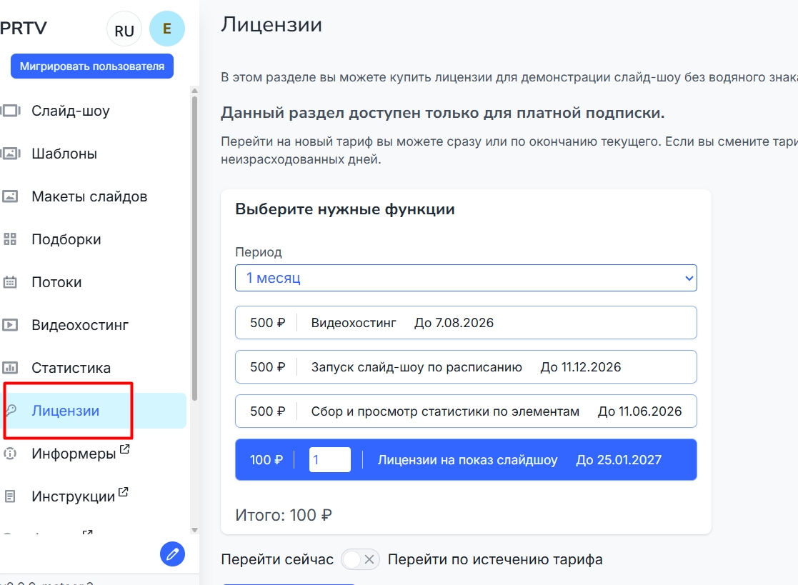 Отдельно вынесен пункт Лицензии, в нем находится информация о платных услугах. Можно приобрести необходимую функцию (видеохостинг, потоки, статистика), а также оплатить лицензии для аккаунта. Подробнее про это здесь.