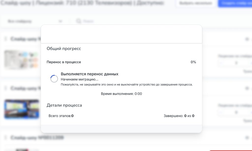 Для переноса всех данных с первого конструктора, нажмите кнопку Мигрировать пользователя. Подождите некоторое время, пока происходит миграция всех слайд-шоу и настроек. Подробнее о процессе миграции написано здесь.