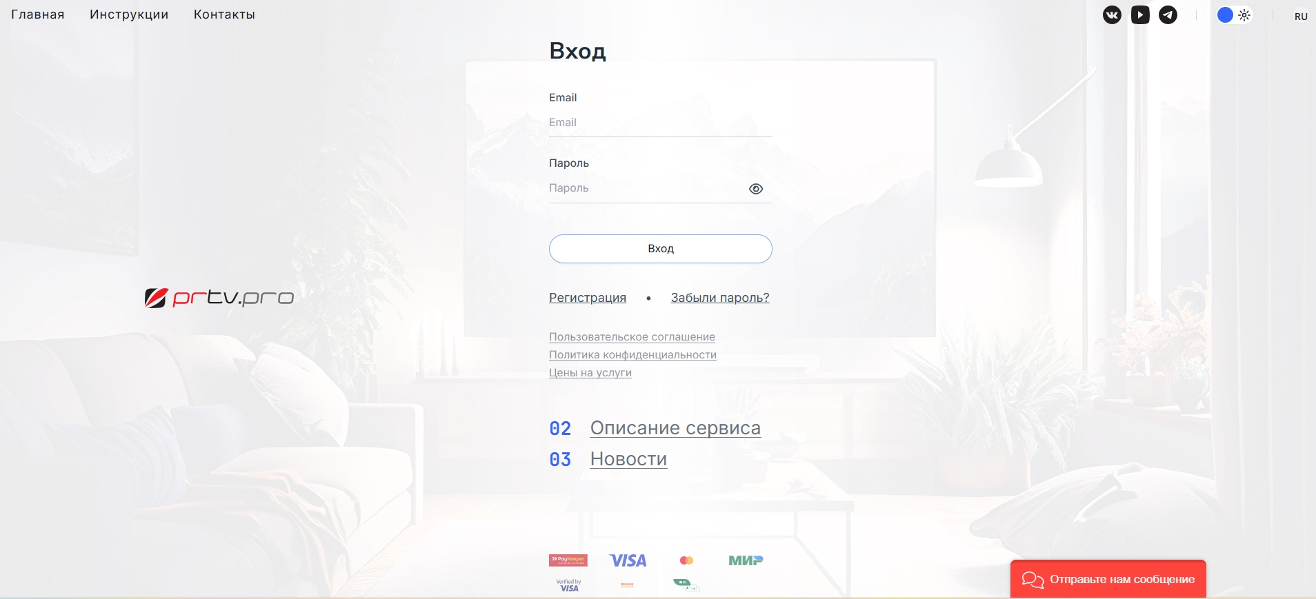 Зарегистрируйтесь или войдите в свою учетную запись. Если вы ранее уже регистрировались в конструкторе PRTV, то прежние логин и пароль подойдут и к новой версии.