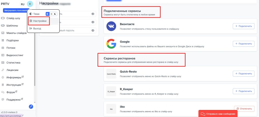 В настройках профиля также можно подключить аккаунт Google и сервисы ресторанов. Сейчас PRTV.pro поддерживает три основных: Quick-Resto, R_Keeper, iiko. Более подробно об их настройке написано в этой статье.