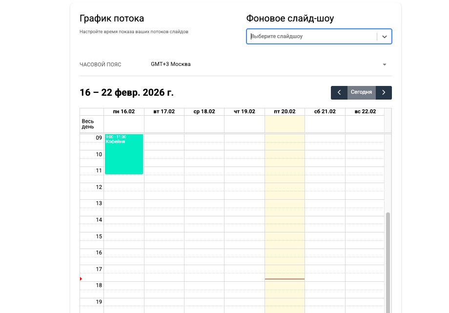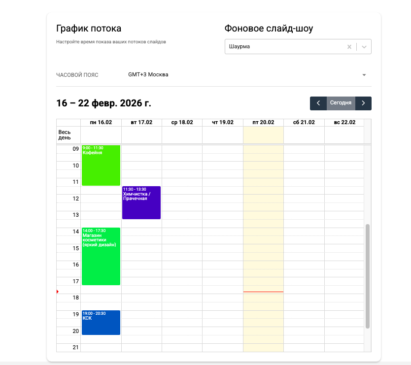 График потока – время показа определенных слайд-шоу, которое вы задаете самостоятельно. Например, с 9:00 до 12:00 у вас на телевизоре отображается слайд-шоу с завтраками, а с 13:00 до 16:00 – меню шаурмы. Можно установить показ по определенным датам и дням недели.