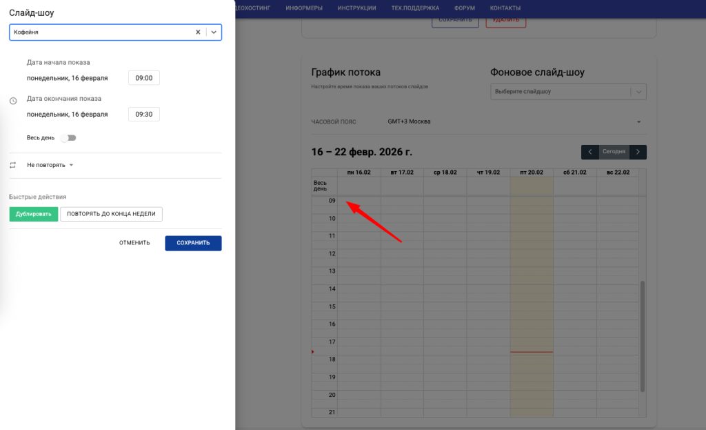 Чтобы выбрать временной интервал для показа нужного слайдшоу, нажмите на соотвествующую ячейку в таблице. Например, нажмем на 9 утра в понедельник. Установим нужное слайд-шоу, и зададим время окончания показа.