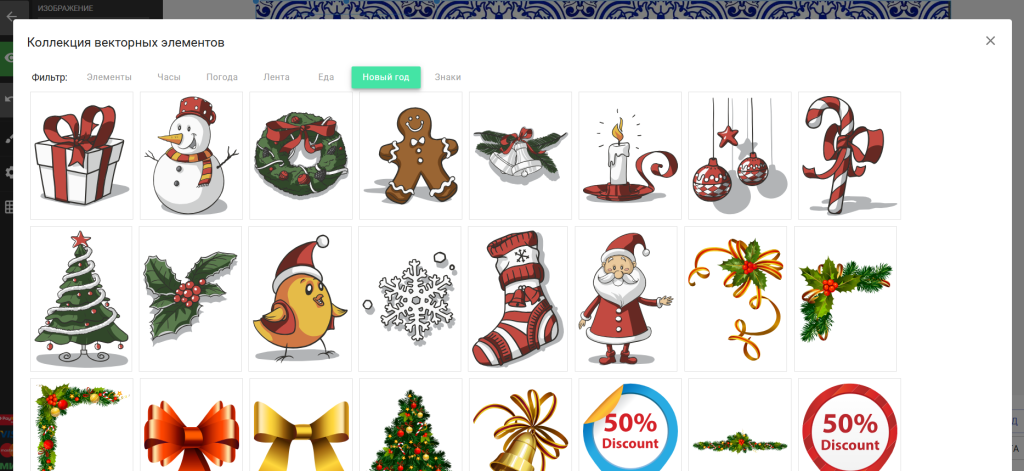 В коллекции конструктора PRTV есть множество встроенных картинок, в том числе новогодних. Здесь и снежинки, и пряничный человечек и елочные украшения – в общем, выбор есть. Чтобы добавить изображения на слайд, нажмите кнопку “Фото”, “Выбрать” -> “Из коллекции”. В категории “Новый год” будет всё, что вам нужно: