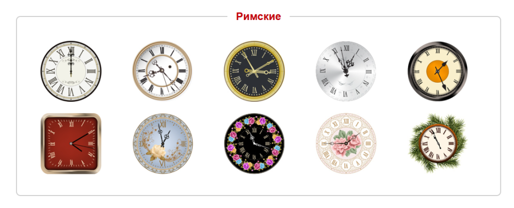 Создать собственные куранты – легко. На той же странице Информеров ищем аналоговые часы с римскими цифрами. Например, для новогодней атмосферы отлично подойдут круглые часы с еловыми ветками или более классический вариант с черным или белым циферблатом.