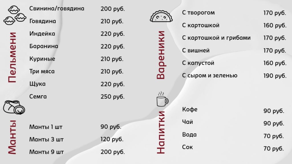 Создать меню-борд для пельменной или вареничной – задача, которая должна решать сразу несколько моментов: сделать акцент на аппетитной подаче, но при этом не потерять в читаемости и структуре: гости должны сразу понять, что взять — с мясом, с картошкой или с вишней.