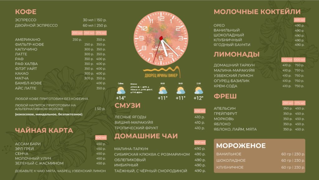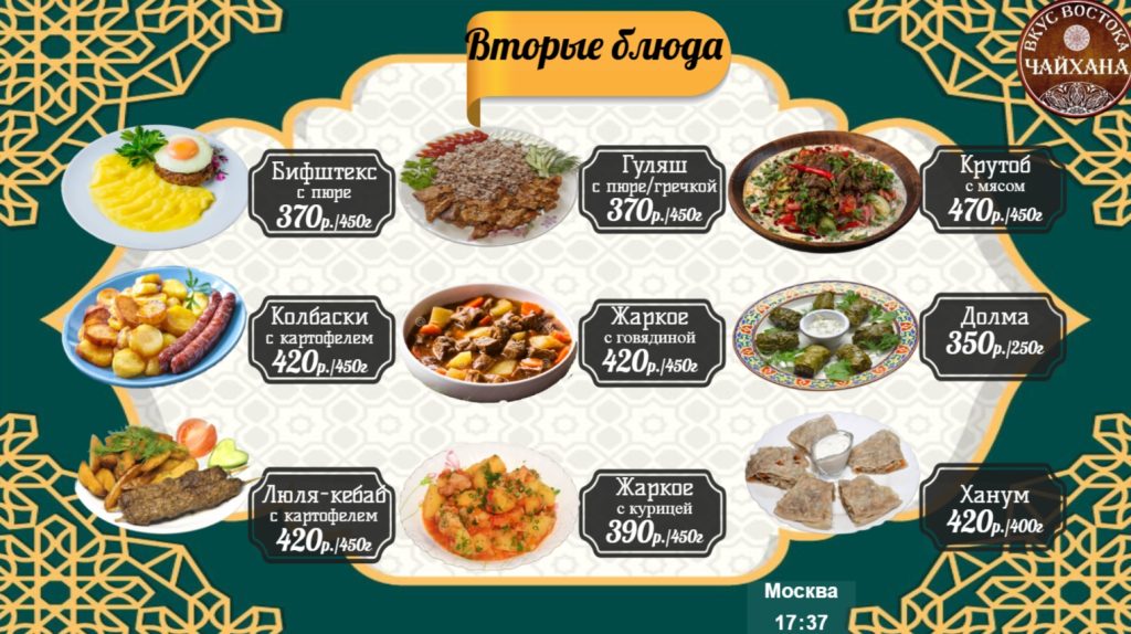Можно показывать меню для столовой на неделю или же запускать слайд-шоу по расписанию – на каждый день недели свое меню. Есть даже возможность отображать меню по часам – утром будут показаны завтраки, днем – обеды, в остальное время можно демонстрировать постоянный ассортимент.