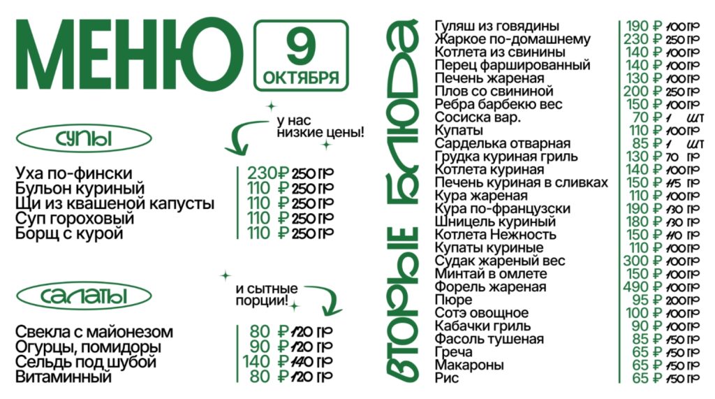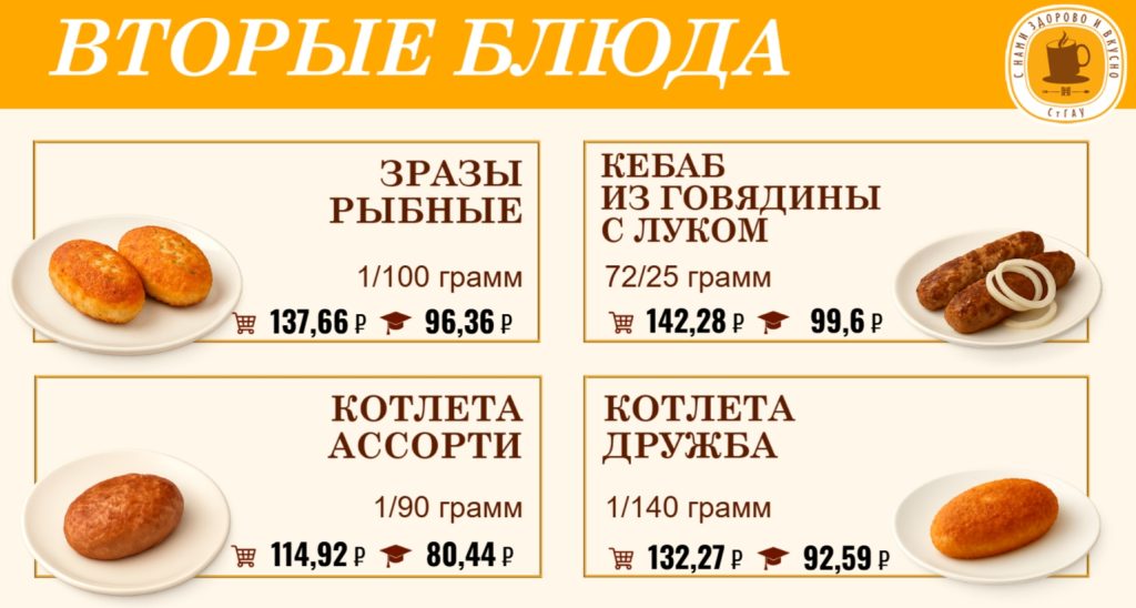 В столовых ассортимент меняется регулярно и было бы удобно добавлять/убирать позиции меню в один клик. Печатная продукция, меловые доски – устаревшие решения, которые не позволяют быстро вносить коррективы в стоимость, состав или наименование блюда.