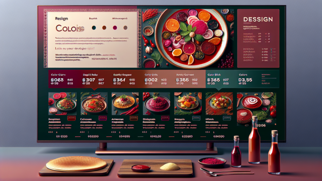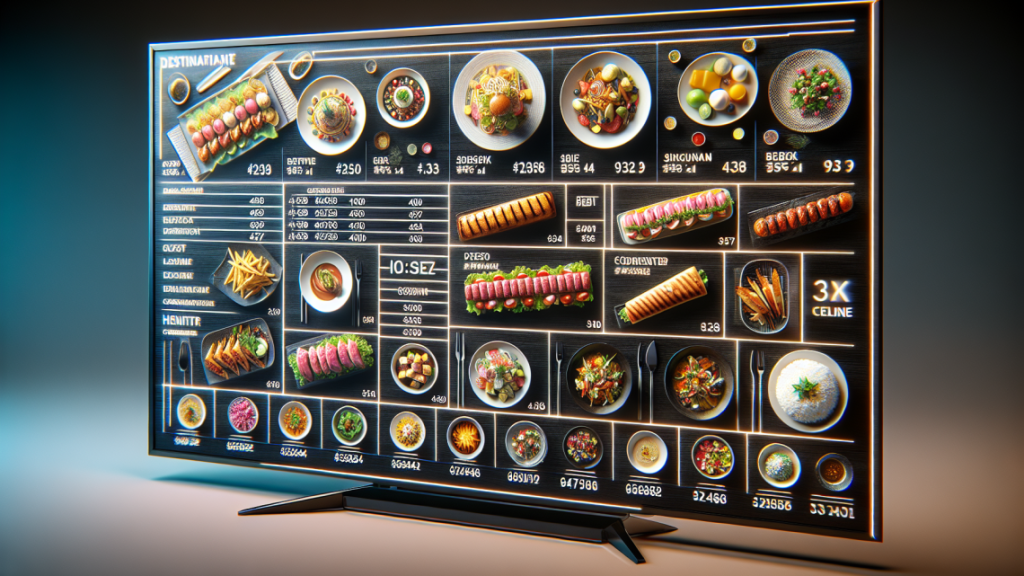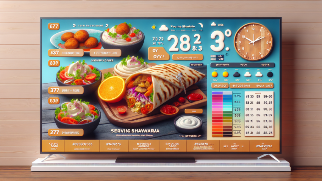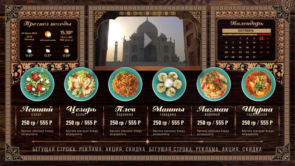 Все блюда меню размещены на ярких тарелках, в едином стиле. Указаны граммовка, цена и состав блюда. Внизу бегущей строкой можно пустить акцию или информацию о скидках. По бокам от главного элемента расположены прогноз погоды и календарь на месяц.