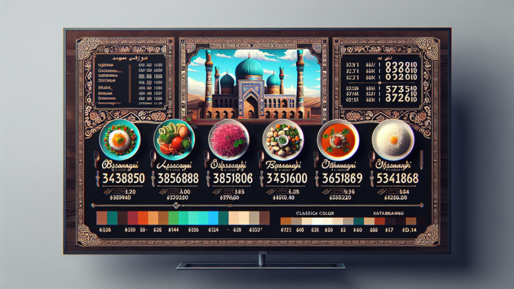 Этот дизайн меню оформлен в восточном стиле, отражающем атмосферу чайханы или кафе с центральноазиатской кухней. Рамки и декоративные элементы по краям стилизованы под восточные орнаменты с резными узорами в золотисто-бежевых тонах.
