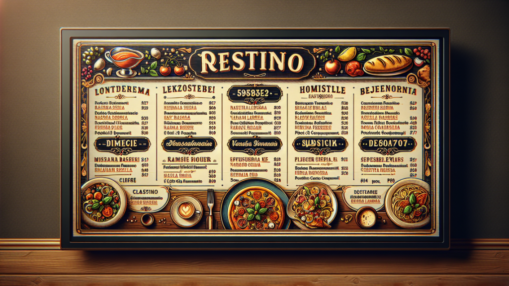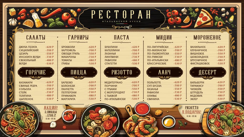 Меню для заведения в итальянском стиле. По краям борда размещены декоративные орнаменты и иллюстрации продуктов: овощи, сыры, специи, чеснок, пицца и паста – все, что ассоциируется с итальянской кухней.
