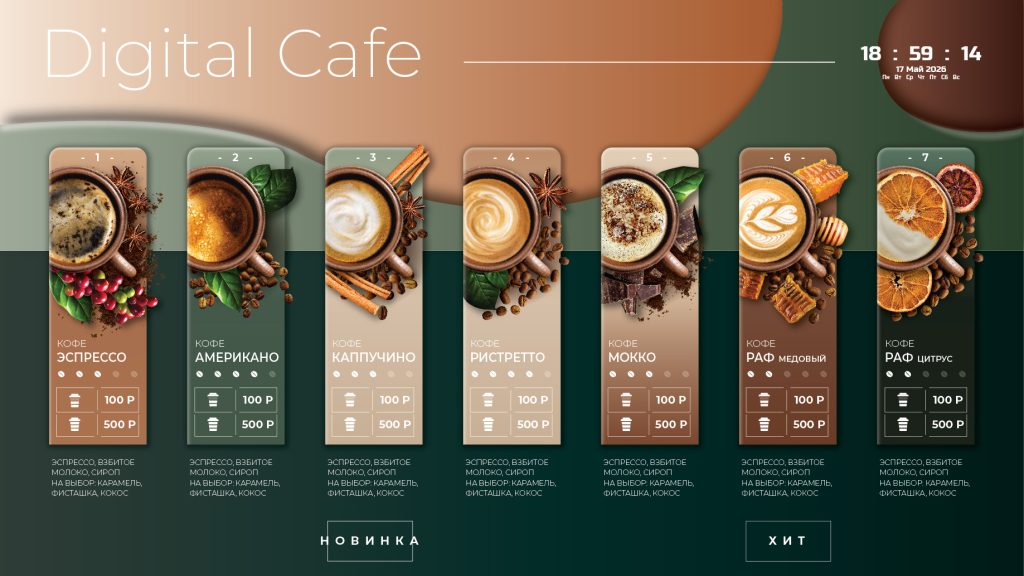 Такой дизайн передает образ цифровой кофейни нового поколения, эстетичной и в духе времени.