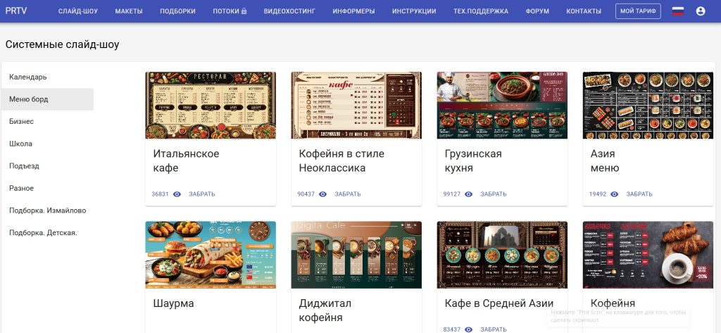 Любое из этих меню можно забрать себе бесплатно уже сейчас. Ищите их в системных слайд-шоу, в категории Меню-борды конструктора PRTV.su: