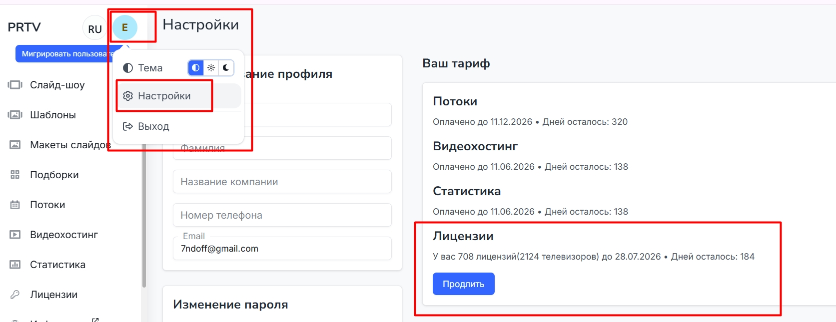 Информацию об имеющихся лицензиях можно посмотреть в Настройках профиля: