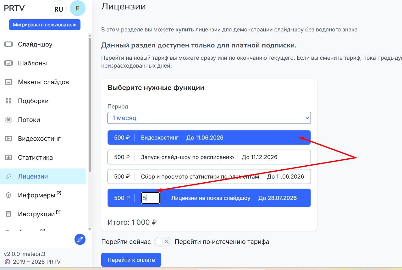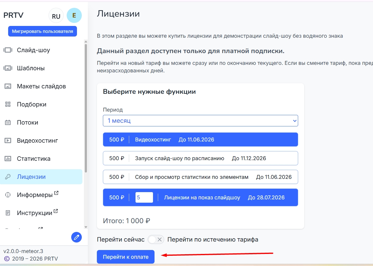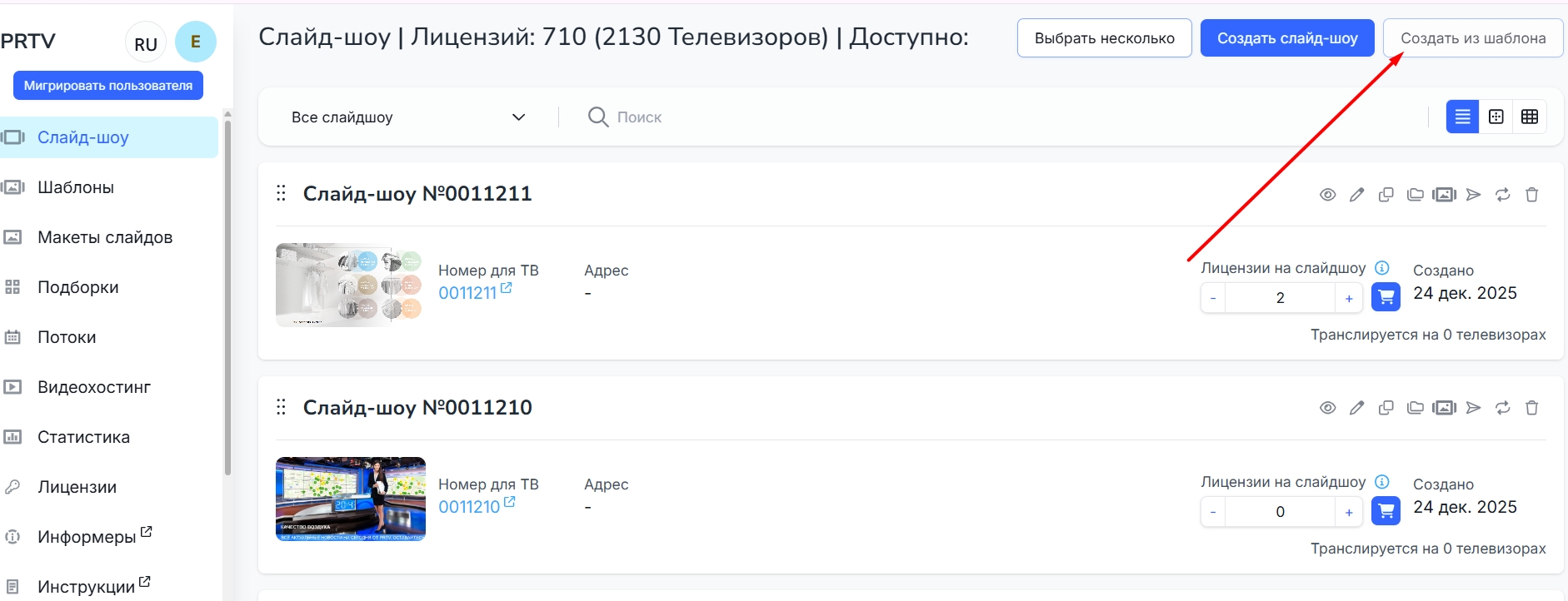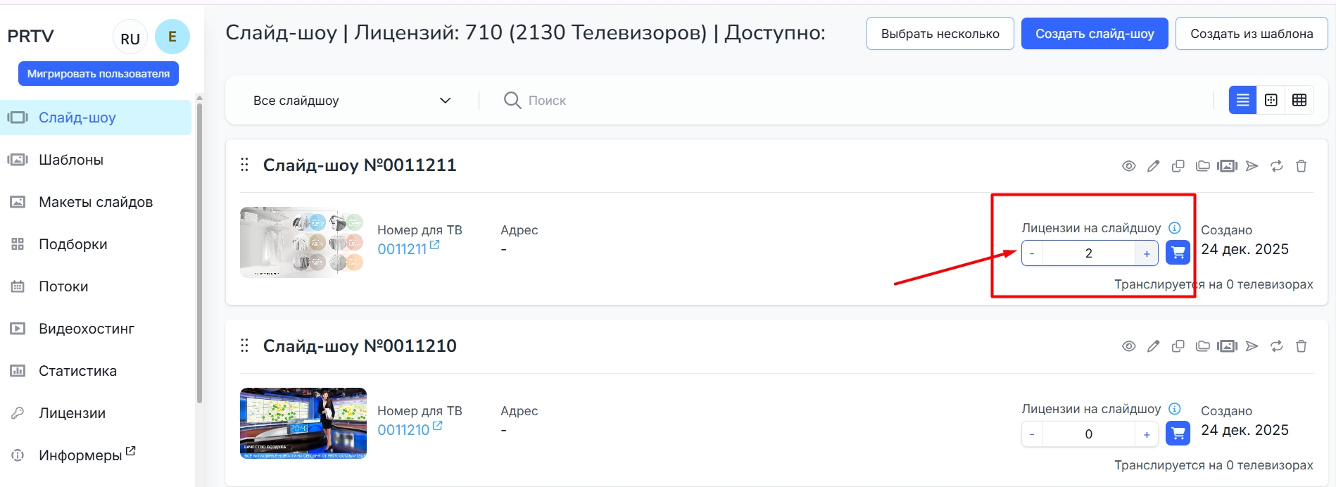 Не забудьте добавить купленные лицензии на слайд-шоу с помощью кнопок. Это необходимо, чтобы исчезла вотермарка PRTV.