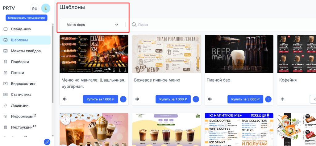Выбираем нужную категорию (в данном примере Меню-борды) и нажимаем кнопку Купить (если шаблон платный):